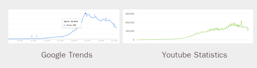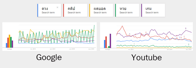 ส่วนภาพด้านขวาเมื่อค้นหาผ่าน Youtube จะเห็นว่าข้อมูลที่ได้ออกจะแตกต่างกัน เพราะคนที่ค้นหาใน Youtube จะเน้นอะไรที่มีความเป็นเอ็นเตอร์เทนมากกว่า เราจึงจะเห็นเส้นของคำว่า ‘คลิป’ และ ‘เกม’ พุ่งขึ้นสูงกว่าคำอื่นๆ ดังนั้นในจุดนี้สรุปได้ว่า เมื่อเราเทียบกับการเสิรช์ผ่านแพลตฟอร์มที่แตกต่างกัน พฤติกรรมการค้นหาก็แตกต่างกันด้วย