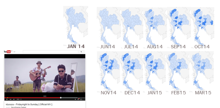 เท่านั้นยังไม่พอ ผมจะทำการวิเคราะห์ลึกลงไปอีก โดยเครื่องมือนี้ยังสามารดูทั้งมิติเวลาและภูมิศาสตร์แบบละเอียด ผมจึงเริ่มไล่ดูข้อมูลนับตั้งแต่เดือน มิ.ย. 2014 ซึ่งเป็นช่วงที่ MV เพลงนี้เริ่มฮิตติดกระแส (Tipping Point) แล้วไล่ไปเรื่อยๆ เพื่อดูว่ามันเริ่มลามจากจุดไหน ผลที่ได้คือเราจะเห็นตามภาพว่า เพลงนี้เริ่มต้นดังจากหาดใหญ่ และค่อยๆเริ่มบูมที่นครปฐมกับระยอง จากนั้นเริ่มลามออกไปตามหัวเมืองใหญ่ แทบไม่ได้เข้ากรุงเทพฯเลย