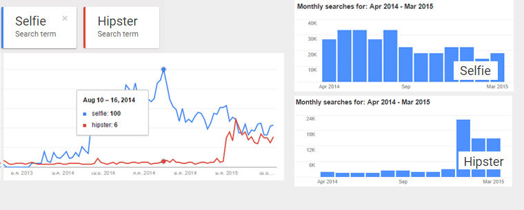 ตัวอย่างด้านล่างเป็นการเปรียบเทียบระหว่างคำว่า ‘Selfie’ กับ ‘Hipster’ เพื่อให้เห็นการประสานการใช้งานระหว่างเครื่องมือสองตัวที่กล่าวถึง ฝั่งซ้ายคือ Google Trends ย้อนหลังไปได้หลายปี ด้านขวาคือ Keyword Planner ย้อนหลังไปได้ไม่กี่เดือน