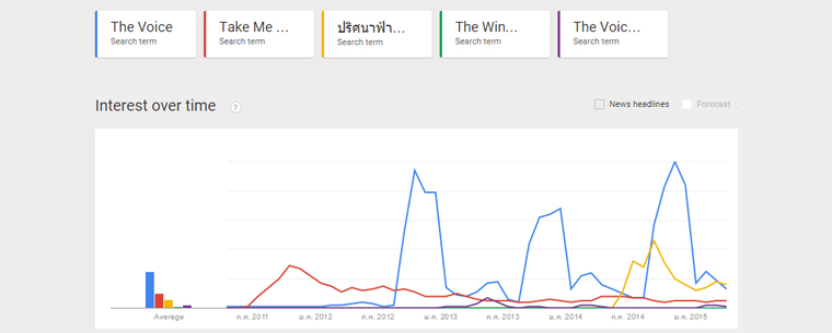 สมมุตว่าคุณกำลังต้องการทำสปอนเซอร์มาร์เก็ตติ้ง มีรายการที่คุณอยากเข้าไปหลายรายการตามภาพด้านล่าง รายการที่คุณกำลังสนใจได้แก่ The Voice (สีแดง) The Voice Kids (สีม่วง) Take Me Out (สีแดง) ปริศนาฟ้าแลบ (สีเหลือง) The Winners is (สีเขียว) ถ้าเรากำลังต้องตัดสินใจสปอนเซอร์ไปในรายการใดรายการหนึ่งแต่ไม่มีข้อมูลอะไรเลย Google Trends ก็จะช่วยเราได้มาก แต่ปกติทางเอเจนซี่ก็ส่งเรตติ้งของแต่ละรายการมาให้พิจารณา แต่เราก็อาจจะลองเช็คอีกทางจากทาง Google Trends นี้ได้