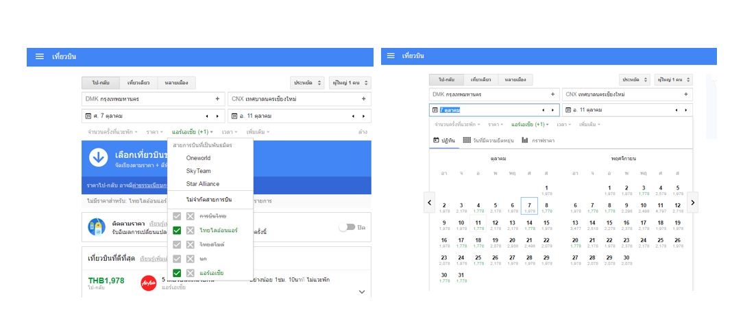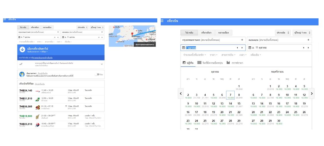 เวบนี้ UX (User Experience) ค่อนข้างง่ายเลยทีเดียว วิธีการก็เหมือนเช็คตั๋วเครื่องบินทั่วๆไป ใส่วันที่เดินทางจะเลือก เที่ยวเดียว ไปกลับ หรือ Multicity ก็ได้ แล้วเลือกเมืองปลายทางระบบจะเรียงผลลัพธ์ในการหาที่ดีที่สุดมาให้อัตโนมัติอย่างภาพข้างล่างด้านซ้าย หรือเราสามารถเลือกวันใกล้เคียงที่ถูกกว่าในช่วงใกล้ๆกัน ระบบก็จะโชว์เป็น calendar ให้เราเลือกได้เลย