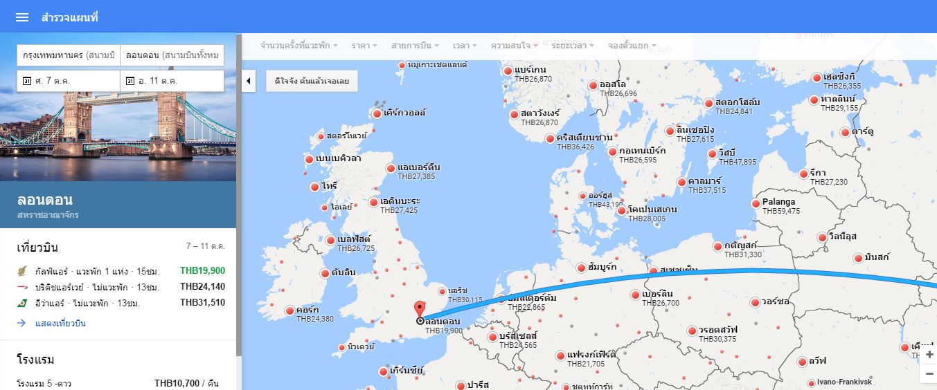 ที่ผมชอบจริงๆของระบบ Google Flights คือเมนูการสำรวจแผนที่ ที่จะโชว์ข้อมูลไปบนแผนที่ครับ อลังการมาก บางทีวางแผนเพลินๆ เห็นจุดหมายเมืองอื่นราคาถูกกว่าก็แทบจะเปลี่ยนใจเลย เพลินจริงๆ เราคลิกเมืองเลือกเล่นได้เรื่อยๆตามนี้ครับ