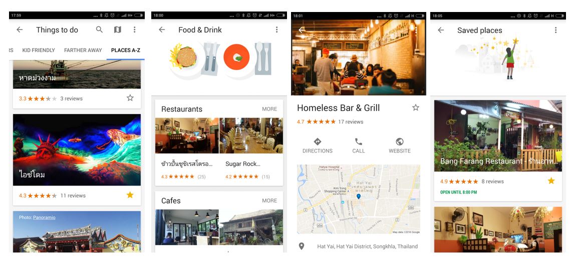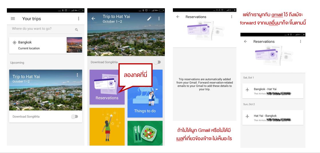 เมื่อทำเสร็จแล้วก็จะเห็นในหน้าแรกของเราว่ามีทริปที่เราเลือกขึ้นมา กดเข้าไปดูอีกครั้ง ก็จะเห็นหน้าจอที่เราพร้อมเล่นต่อไป หน้าตาตามด้านล่างที่มีเมนู Reservations , Things to do, Saved places และ Food&Drink ถ้าสังเกตจะเห็นว่าเมนู Reservations มันจะ sync เข้ากับ Google Calendar ของเราเลย และถ้าเรามีเมล confirmation letter จากสายการบินส่งมาที Gmail (หรือแค่ฟอร์เวิรด์มาจากเมลยี่ห้ออื่นเข้ามาที่ Gmail ก็ได้) ระบบมันจะผูกเข้า Calendar และเข้ามาที่ Google Trips โดยอัตโนมัติเลย (เมนูนี้เราเลือกให้ Disable ไม่ต้อง Sync ก็ได้) ซึ่งผมเลือกเมืองสงขลาเพราะว่าผมมีตั๋วเครื่องบินไปหาดใหญ่เร็วๆนี้อยู่แล้ว ก็เลยลองดู ตามภาพด้านล่าง