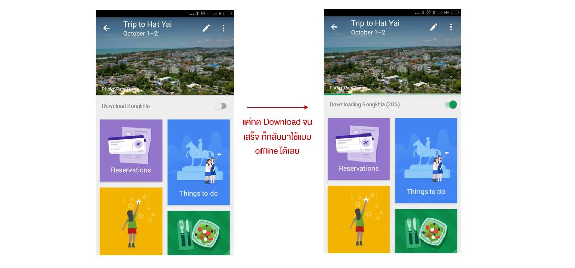 เมื่อทำเสร็จแล้วเมื่อกลับมาเมนูหลัก ก็จะเตรียมพร้อมเอาไปใช้เดินทางได้แล้ว ข้อดีของ Google Trips คือเราสามารถ Download เก็บไว้ได้ กรณีที่เราไม่ได้เปิดอินเตอร์เน็ตมือถือเวลาเดินทาง สะดวกมากๆ ซึ่งเมื่อเรา Download เสร็จ มันก็หน้าตาเหมือนเดิม ผมลองเปิด Airplane โหมด ก็เข้าไปดูข้อมูลทริปของเราได้ตามปกติ จบ ไปเที่ยวได้