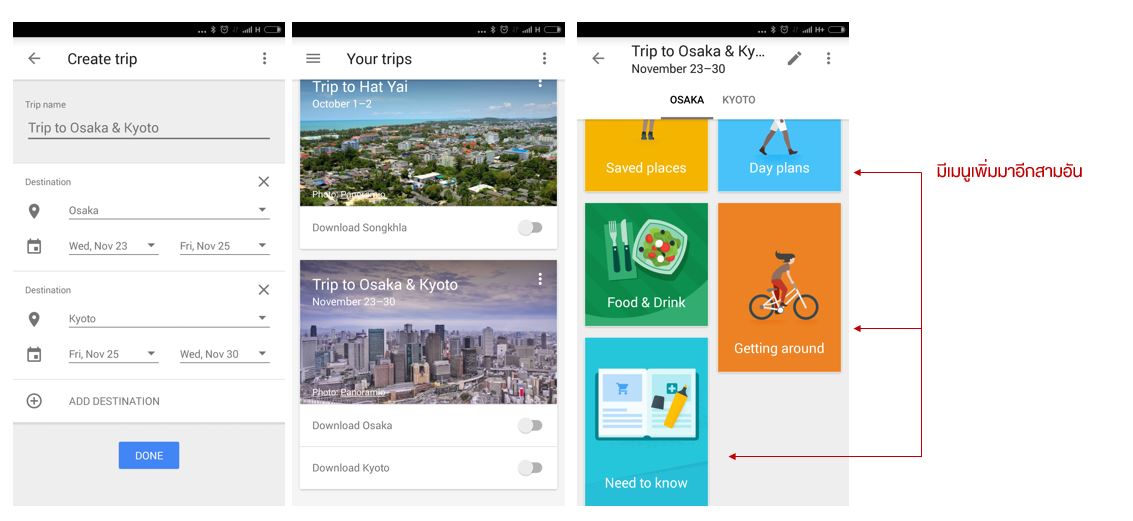 แต่ว่าจริงๆแล้วฟีเจอร์ของแอพฯ Google Trips นี้ยังมีมากกว่านั้น ผมขอลองเลือกทริปใหม่ สมมติว่าทริปทีผมจะไปคือ โอซาก้า และเกียวโต ในทริปเดียวกันเพื่อจะไปดูใบไม้เปลี่ยนสีในช่วงปลายเดือน พ.ย. ผมก็เลือกได้ในทริปเดียว เราก็สามารถเลือกเมืองและกำหนดวันได้ตามใจชอบ เมื่อเสร็จแล้วหน้าตาจะเป็นประมาณนี้