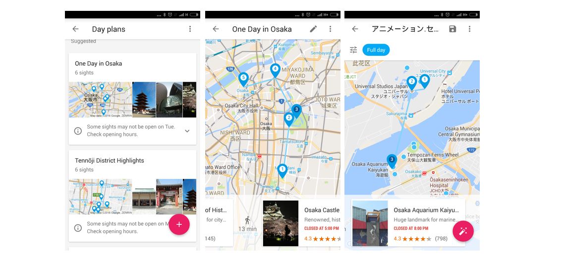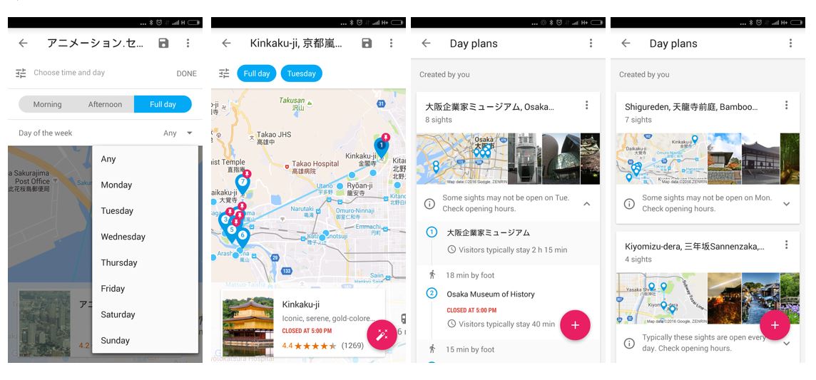 (ซึ่งผมลองเล่นดูแล้ว จะว่าจุดนี้จะว่าดีก็ว่าดี จะว่างงๆก็ใช่ เพราะระบบอัจฉริยะเกินไป เวลามันวางรู้ทใหม่ มันก็เปลี่ยนแปลงสถานที่เรา หลักๆคงอยากให้เราเที่ยวสถานที่ใหม่ๆที่อยู่ใกล้เคียงกันให้ครบเต็มวัน หรือครึ่งวัน ยกตัวอย่าง ผมลองเลือกเที่ยวเกียวโต โดยอยากเที่ยววัดคินคาคุจิหรือวัดทองที่อยู่ย่านตัวเมืองแล้วไปดูใบไม้เปลี่ยนสีที่ย่านอาราชิยาม่าฝั่งตะวันตกของเกียวโต ระบบก็ประมวลให้แบบงงๆเล็กน้อย นอกจากนี้ก็ยังไม่สามารถเลือกร้านอาหารลงไปในแผนการเที่ยวได้ (หรือผมหาไม่เจอก็ไม่รู้) รวมถึงวิธีการเดินทางอันแสนซับซ้อนของเมืองเกียวโต คงยังต้องมีการพัฒนาต่อไปเพราะเป็นจุดที่คนคงอยากได้มากที่สุด ฟีเจอร์นี้อยากให้ลองเล่นจนคุ้นมือครับ เพราะมันอธิบายลำบาก )