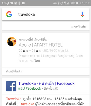 หรือว่าลองพิมพ์คำว่า Traveloka ลงไปใน Google Search ก็จะขึ้นให้เลยว่าเราจองโรงแรมอะไรไปเมื่อไหร่ สะดวกมากเวลาเราจองแล้วเราลืมไปว่าเราจองโรงแรมอะไรอยู่ที่ไหน